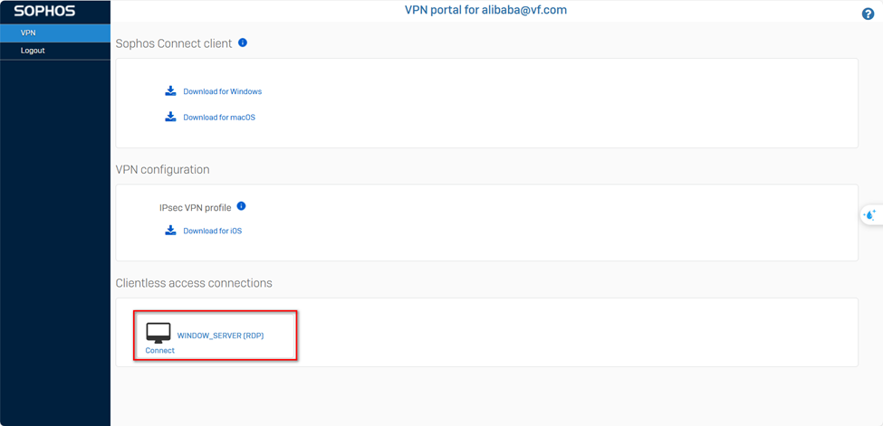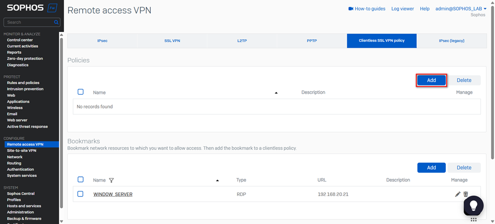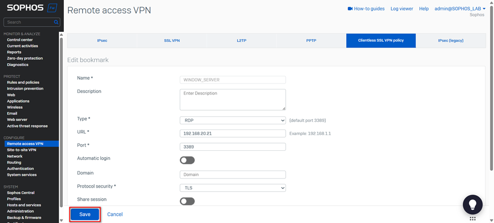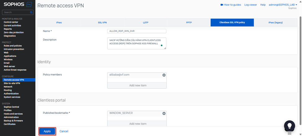 Mục tiêu: Cho phép người dùng truy cập máy chủ nội bộ (Windows Server) thông qua RDP bằng trình duyệt web, sử dụng tính năng Clientless VPN trên Sophos XGS.
