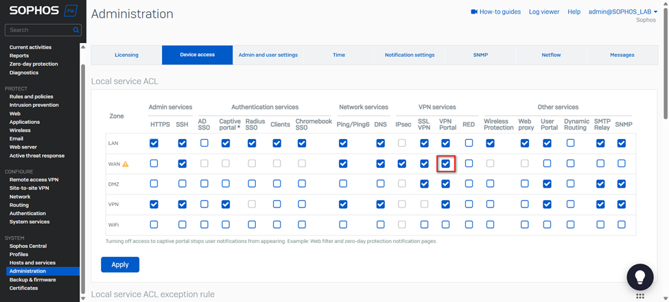 - Ở dòng VPN Protal, tick chọn zone WAN