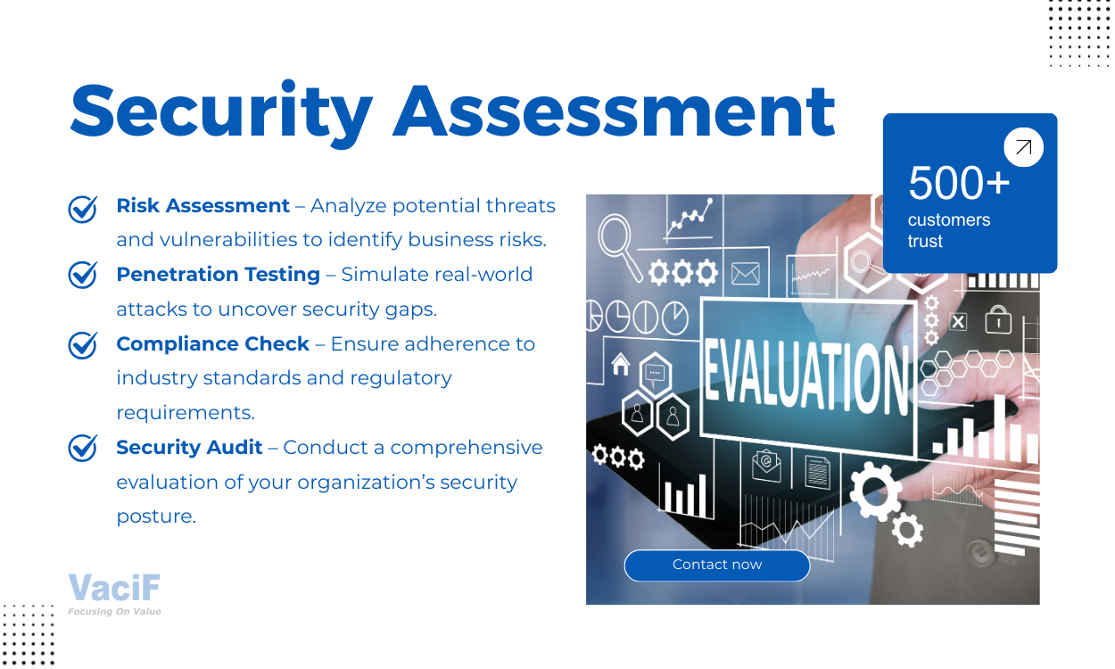 In the context of increasingly sophisticated cybercrime and the ever-growing security threats, assessing and testing the safety of IT systems is a critical component of every business’s security strategy. Our security assessment service helps identify, analyze, and remediate vulnerabilities in your system before they can be exploited by threats. Using advanced assessment tools and methodologies, we provide a comprehensive and accurate view of your organization’s security posture.