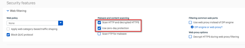 • Use web proxy instead of DPI engine: Web Proxy giúp kiểm soát nội dung web tốt hơn, trong khi DPI Engine giúp tốc độ nhanh hơn. Nếu bật Web Proxy, tất cả lưu lượng web sẽ được chuyển qua proxy để kiểm soát nội dung. Nếu chọn DPI Engine, firewall sẽ quét trực tiếp mà không qua proxy, giúp tăng hiệu suất nhưng có thể kém hiệu quả với HTTPS.