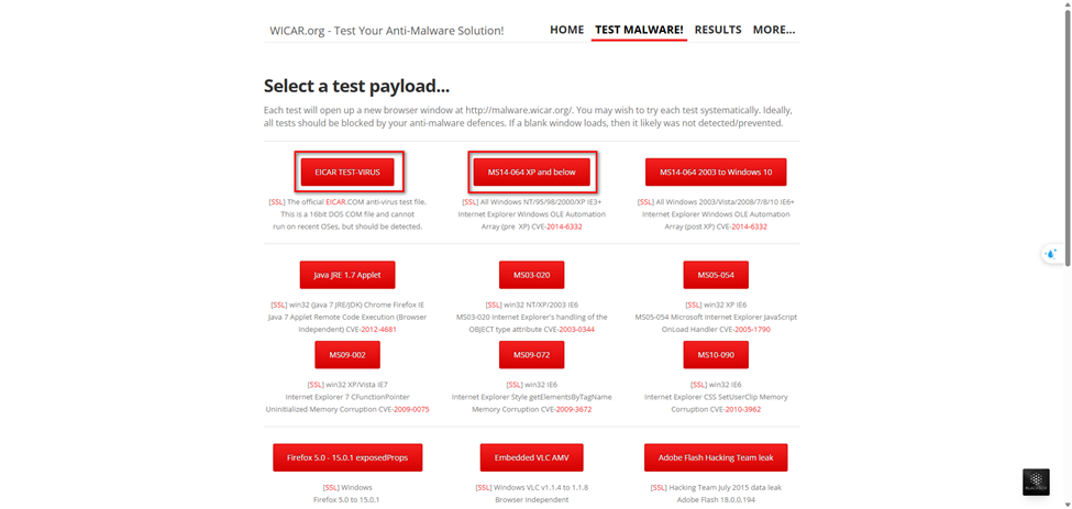 Truy cập trang web: https://www.wicar.org/ và chọn download cái file test phía dưới