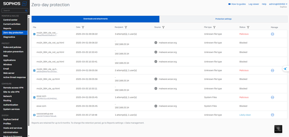 Để kiểm tra kết quả trên Sophos Firewall chọn Zero-day Protection > Dowloads and Attachments.