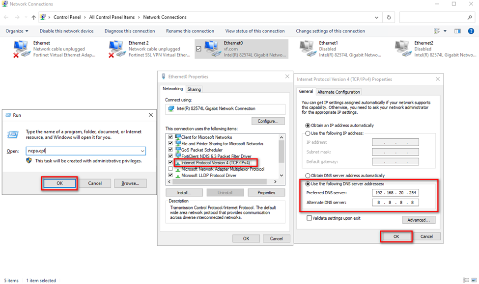 5. Điền vào Preferred DNS server là IP của Domain Controller (VD: 192.168.20.254).