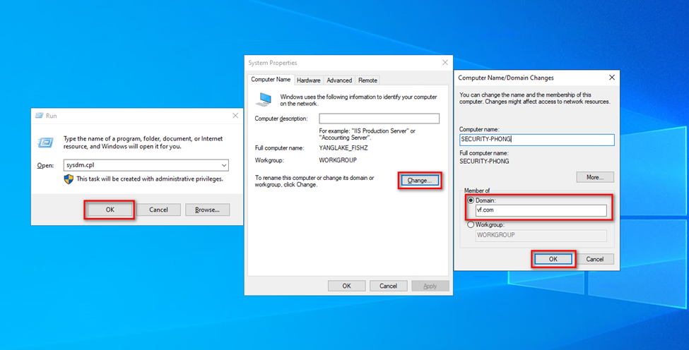 2. Chọn Change, đổi tên máy nếu cần và nhập tên domain (ví dụ: vf.com).