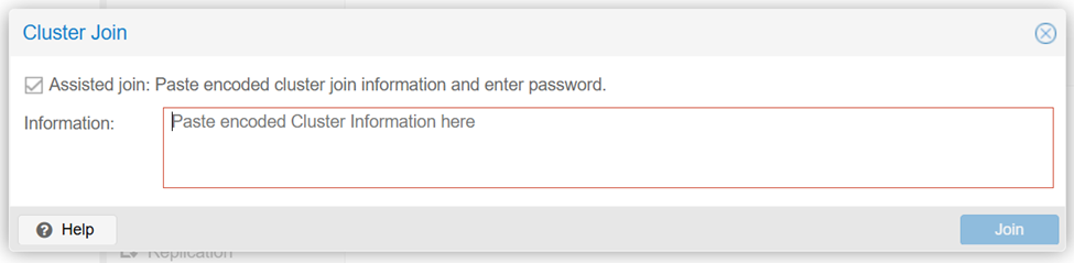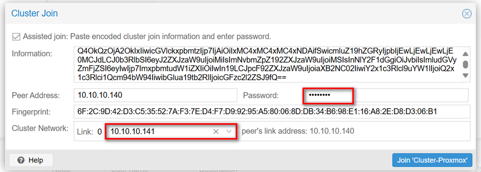 - Khi mình pass cái Copy Information xong thì nó sẽ hiện ra như này, ở đây mình cần điền Password root của proxmox1 và ở chỗ Link: 0 thì sổ xuống rồi chọn vào IP của proxmox2 rồi chọn Join ‘Cluster-Proxmox’.