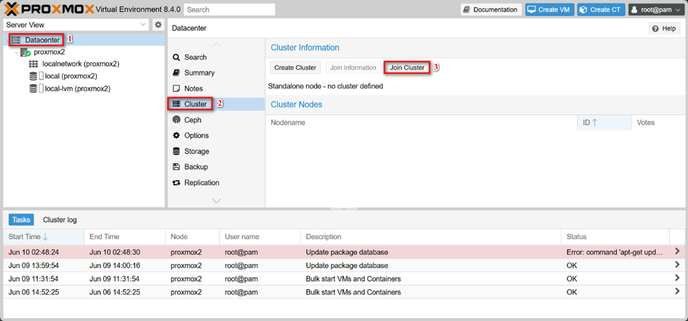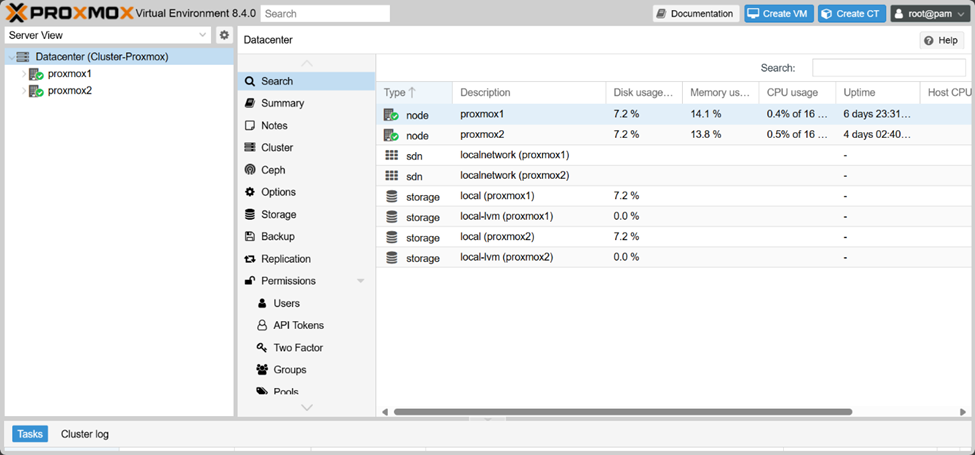 - Như vậy là đã tạo thành công cluster kết nối proxmox2 đến với node chủ là proxmox1