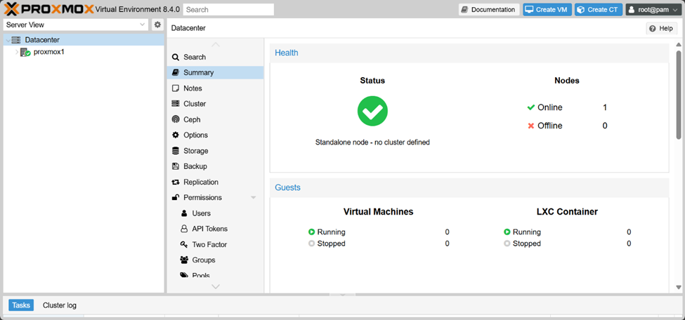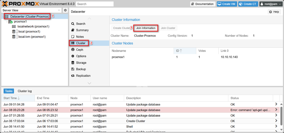 - Sau khi nhấn Join ‘Cluster-Proxmox’ xong quay lại node chủ là proxmox1 xem coi mình đã join proxmox2 chưa.