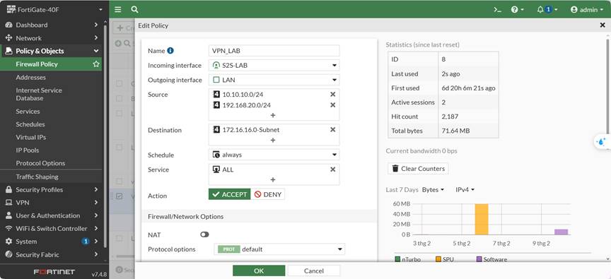 - Tắt NAT trên policy đi vào VPN; bật NAT sẽ làm sai nguồn và gói tin không match selector.