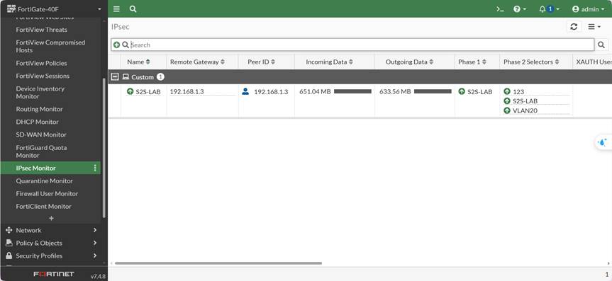 Fortinet: Monitor → IPsec Monitor → Tunnel: UP (Có Incoming / Outgoing Data)