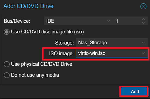 Chọn ổ lưu trữ chứa file .iso -> Chọn virtio-win.iso -> Nhấn Add.