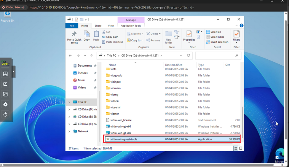 Sau khi add ổ đĩa đó vào. Trên máy ảo đó, vào File Explorer -> Chọn ổ đĩa chứa virtio-win.iso -> Nhấn virtio-win-guest-tools.