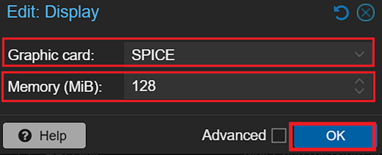 Chọn “Graphic card: SPICE” và “Memory (MiB): 128” -> Nhấn OK