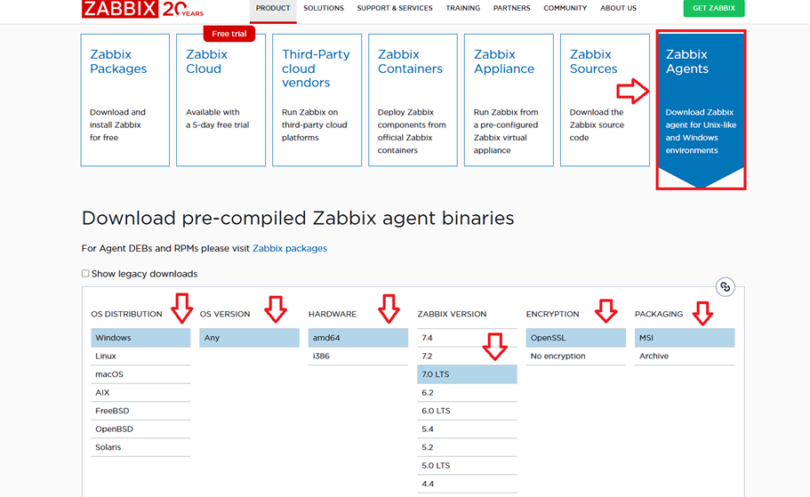 Tiếp theo, chọn OS Distribution: Windows -> OS Version: Any -> Hardware: amd64 -> Zabbix version: 7.0 LTS -> Encryption: OpenSSL -> Packaging: MSI