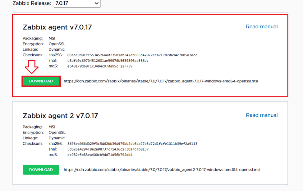 Nhấn Download tại ô “Zabbix agent 7.0.17”