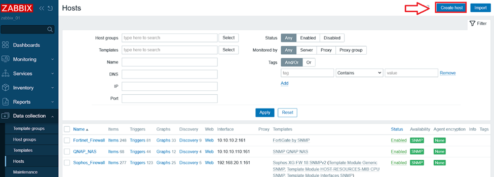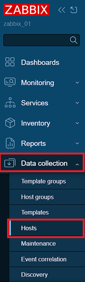 Trên giao diện Zabbix Server, ở thanh bên trái màn hình, nhấn Data collection -> Hosts