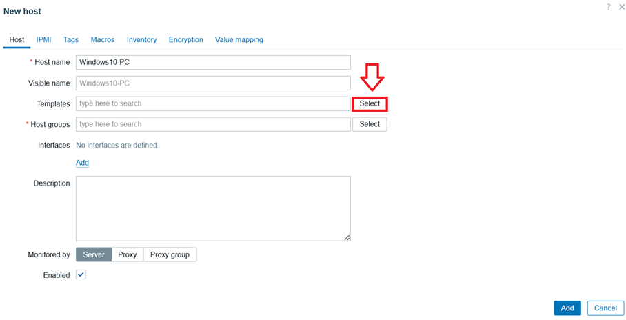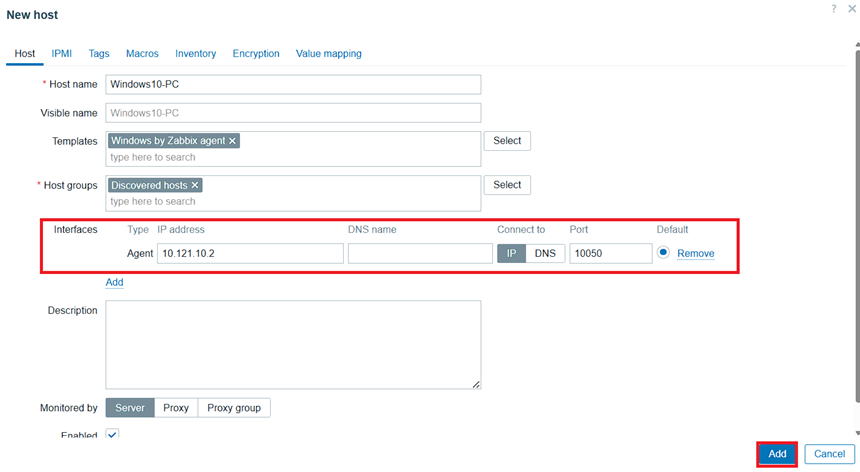 Sau đó, tiến hành nhập các trường thông tin của máy trạm Windows cần được giám sát vào Zabbix server như sau: