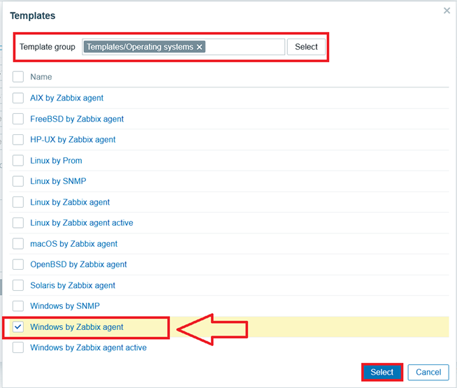 Nhấn Template “Windows by Zabbix Agent” -> Nhấn Select