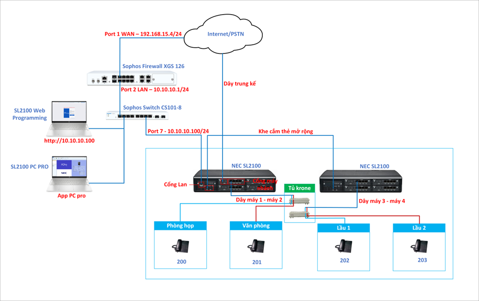 • Bài viết này giúp bạn hiểu rõ về mô hình hệ thống mạng và tổng đài nội bộ sử dụng thiết bị NEC SL2100 kết hợp với tường lửa Sophos XGS để đảm bảo an toàn và kết nối mạng hiệu quả. Hệ thống được được kết nối qua Sophos Switch CS101-8, cho phép truyền thông nội bộ và truy cập internet/PSTN. Tổng đài NEC SL2100 được cấu hình với 64 máy nhánh (extension) như 100, 101, 102, 103, đảm bảo liên lạc nội bộ với nhau và 6 trung kế. Quản lý tổng đài được thực hiện qua các ứng dụng SL2100 Web Programming hoặc PC PRO. Toàn bộ hệ thống hoạt động trong dải mạng nội bộ 10.10.10.0/24, với cổng WAN truy cập internet qua IP 192.168.15.4/24. Ngoài có thể thay thế card mở rộng tùy theo nhu cầu của người sử dụng.