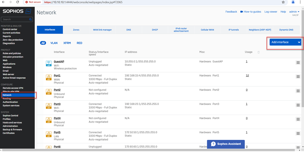• Để tạo lớp mạng dhcp cấp cho thiết bị tổng đài (IP động), vào mục Network > Add interface