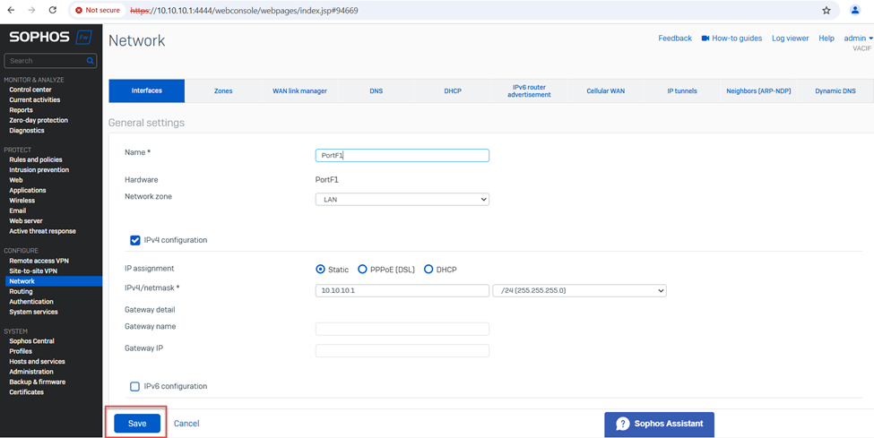 • Nhập tên Name: PortF1 > Network zone: LAN > Tick chọn Ipv4 configuration > IP assignment: Tick chọn Static > Ipv4/netmask: Đặt dãy IP mà bạn muốn.