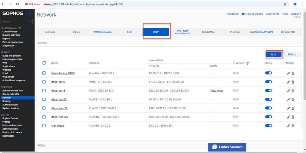 • Tiếp theo vào mục Network > DHCP > Add để tạo lớp mạng dhcp cấp cho các thiết bị.
