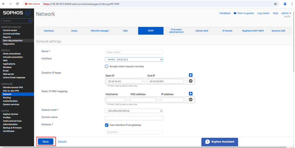 • Interface: chọn port cần cấp > Dynamic IP lease: Đặt dãy mạng IP mà bạn muốn cấp > Subnet mask: /24 > Save