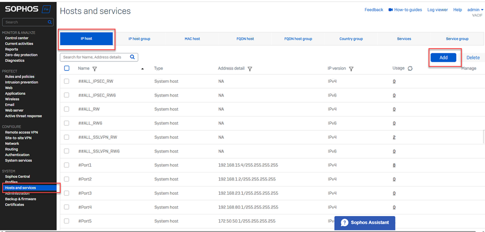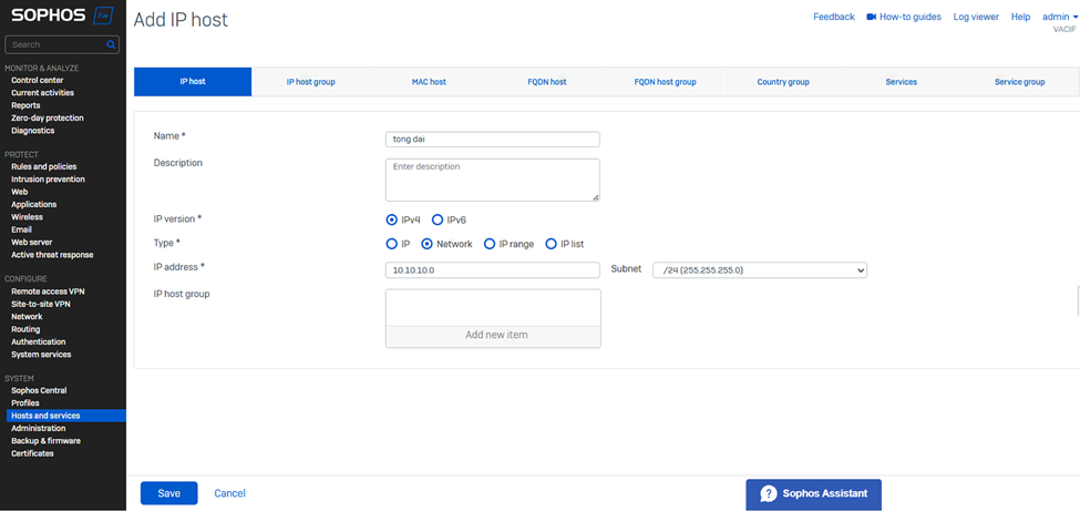 • Tạo services cho dãy mạng cần ra internet > Vào mục Host and services > IP host > Add.