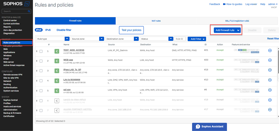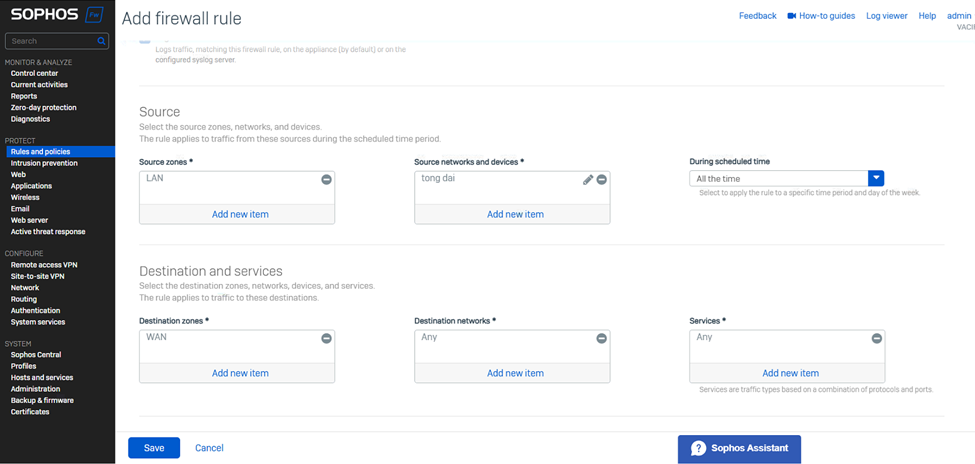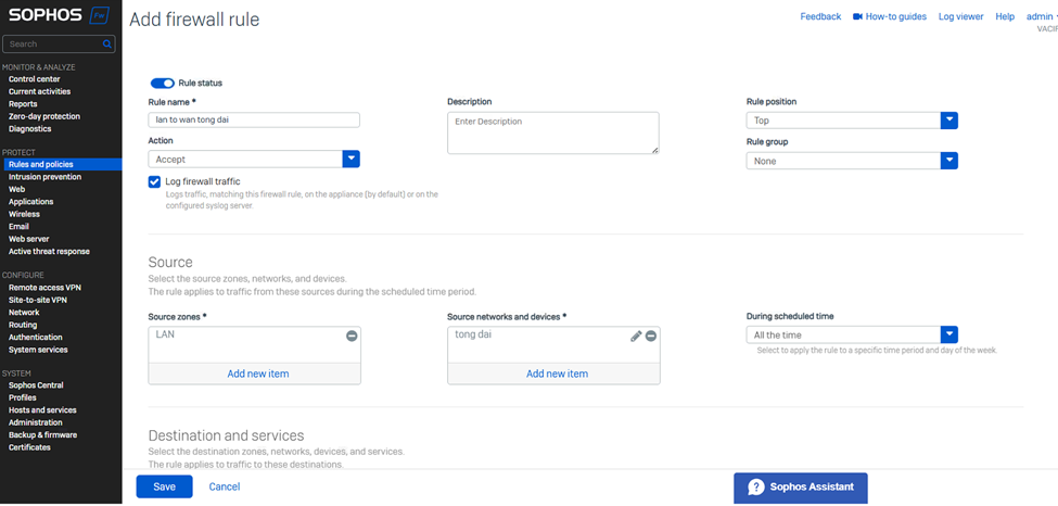 • Tạo rule cho lớp mạng ra internet > Rule name: Đặt tên cho rule > Rule position: Lựa chọn ví trí cho rule > Rule group: Chọn None > Source zone: LAN > Source networks and devices: Chọn services mà đã tạo trước đó > Destination zones: WAN > Destination networks: Any > Nhấn save.