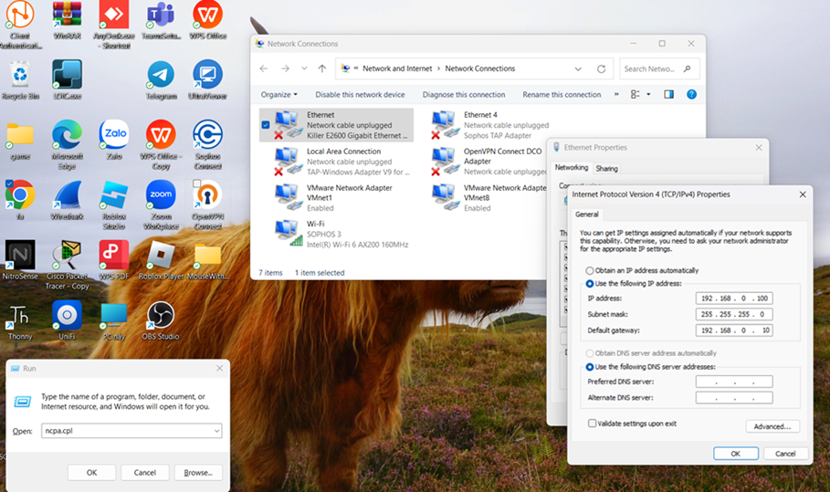 • Vào mục 10-12: CPU Network Setup để đặt địa chỉ ip cho tổng đài > IP address: 10.10.10.100 > Subnet Mask: 255.255.255.0 > Default Gateway: 10.10.10.1. Sau đó cắm dây lan vào switch để switch cấp IP cho tổng đài.