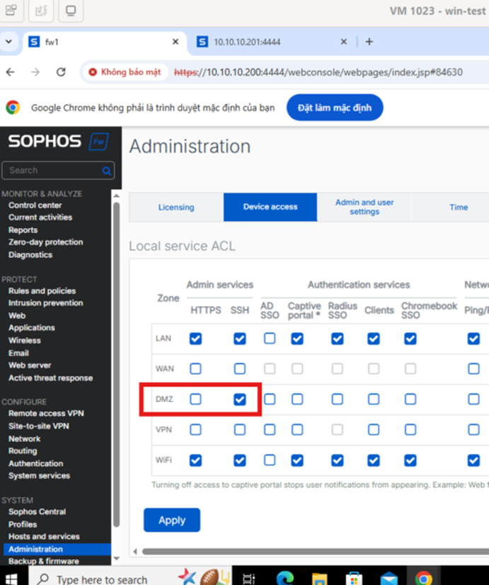 Bước 2: Bật SSH trên cả 2 firewall -> Vào mục Administrator -> Device access -> Tick chọn DMZ