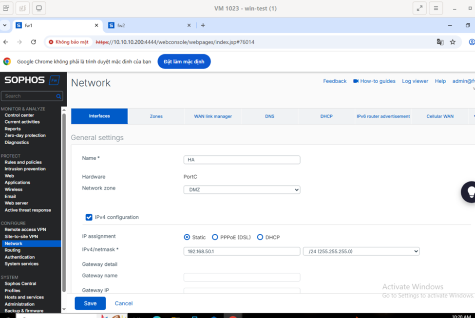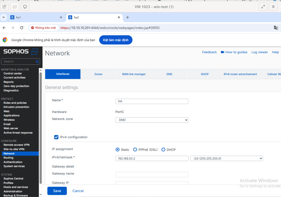Sau khi tạo và chạy thành công 2 node firewall thì ta vào node win để truy cập vào giao diện của 2 firewall
