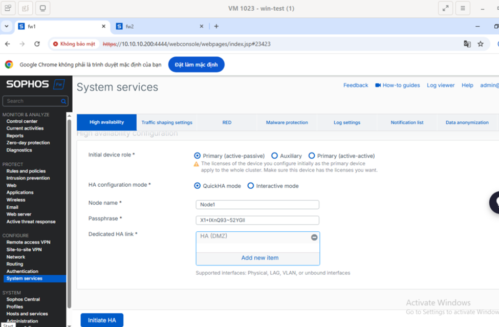 Vào mục System services -> Chọn Primary (active-passive) -> Tick chọn QuickHA configuration mode -> Dedicated HA link: Chọn Port HA đã tạo từ trước.