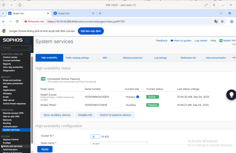 Trên node 1 firewall 1 đang là thiết bị chính primary