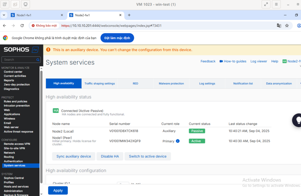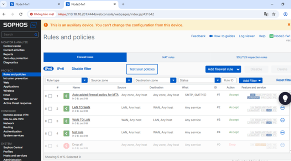 Node 2 firewall 2 đang là thiết bị phụ auxiliary
