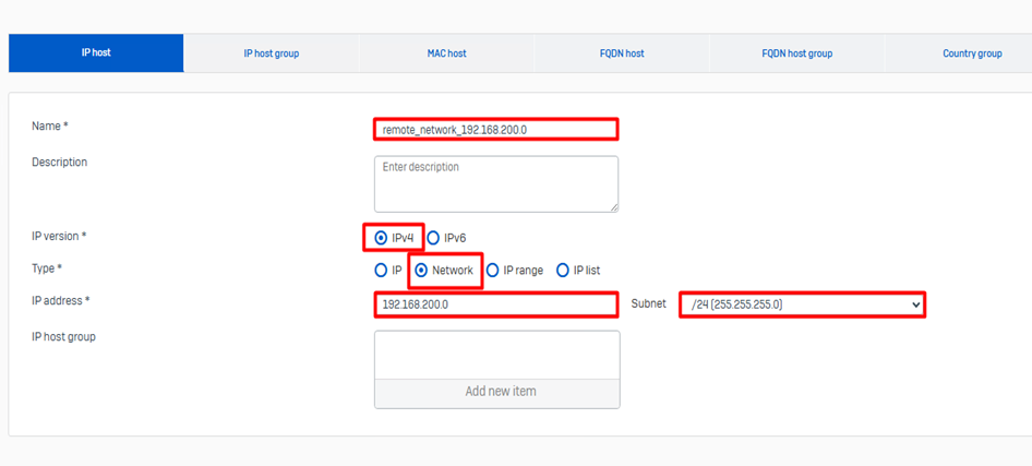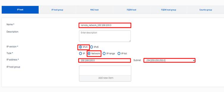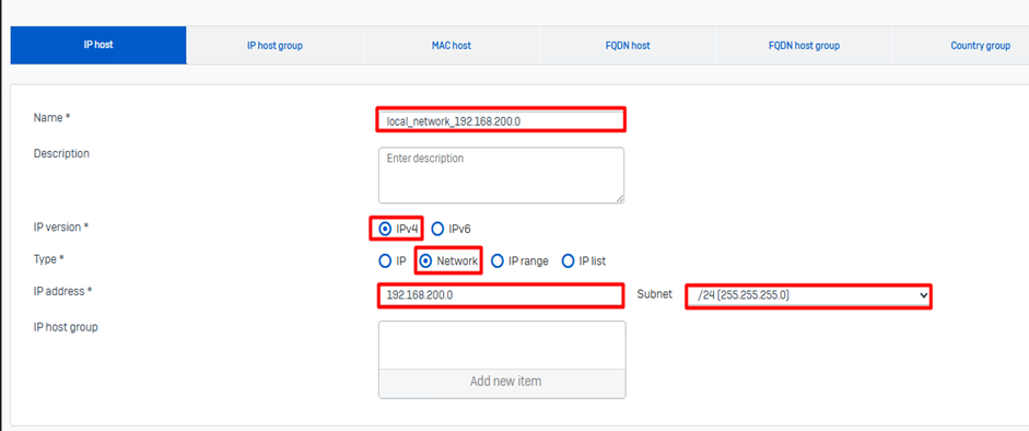 Đến phần Hosts and services > IP Host > Add để thêm local and remote LAN network như hình ở bên dưới.