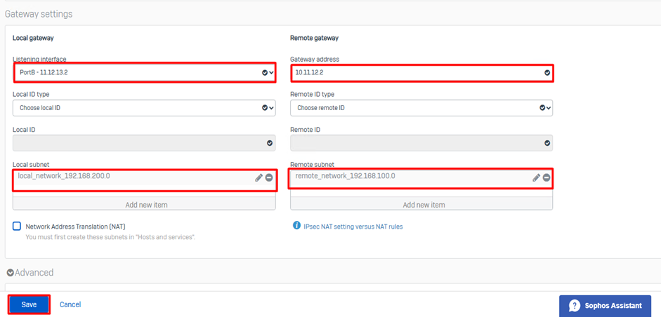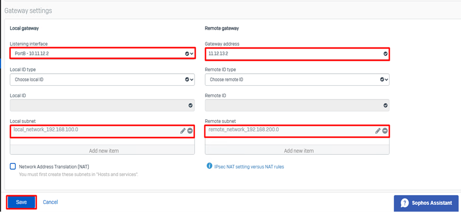 Chọn Listening interface là PortB và Gateway address là WAN IP address của Firewall phía Branch-Site. Tương tự chọn Local subnet là local_network_192.168.100.0 và Remote subnet là remote_network_192.168.200.0