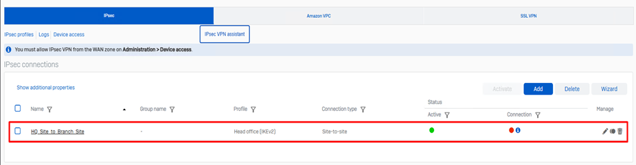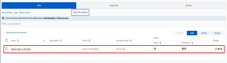 Đến phần Site-to-Site VPN > IPsec Connections, kiểm tra trạng thái kết nối.