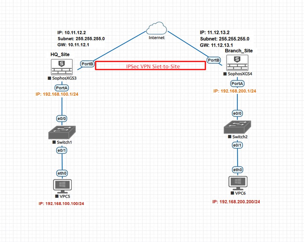 Bài viết này sẽ giúp bạn cấu hình IPSec site-to-site giữa Head office và Branch office trên Sophos Firewall. Ví dụ như mô hình mạng ở trên mô tả kết nối giữa trụ sở chính(HQ-Site) và chi nhánh văn phòng(Branch-Site).