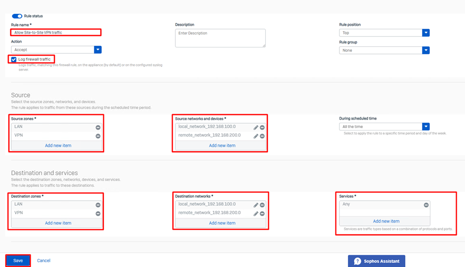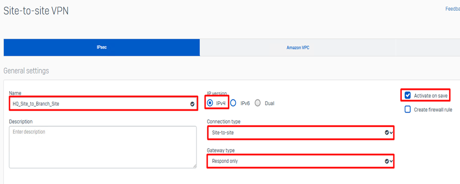 Đặt tên cho kết nối VPN và chọn Connection type là Site-to-Site đối với Policy-Based VPN. Tích chọn Active on save, tạo firewall rule sau. Chọn Gateway type là Respond only bởi vì khởi tạo từ chi nhánh sẽ được phản hồi từ trụ sở chính.