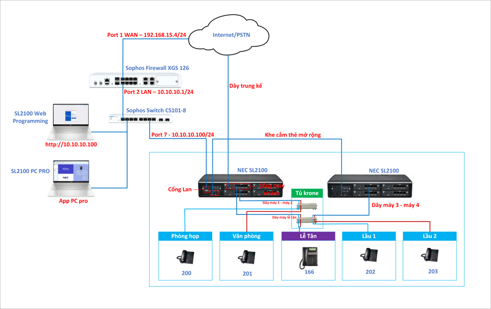 - Bài viết hướng dẫn triển khai và cấu hình hệ thống tổng đài nội bộ NEC SL2100, bao gồm cách đấu nối dây máy nhánh qua tủ Krone, khai báo và cài đặt số máy nhánh, thiết lập chức năng từng máy, chuyển tiếp cuộc gọi và tạo nhóm máy nhánh theo khu vực. Hệ thống hoạt động ổn định trong nội bộ, được quản lý thông qua phần mềm SL2100 Web Programming.