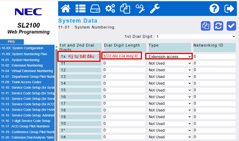 - Vào mục 11-01: System Numbering để thiết lập đầu số cũng như độ dài của máy lẻ, ví dụ: số 200.