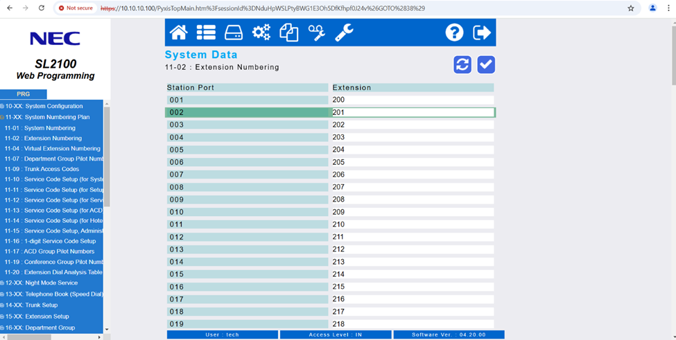 - Vào mục 11-02: Extension Numbering để gán số máy lẻ vào cổng máy nhánh