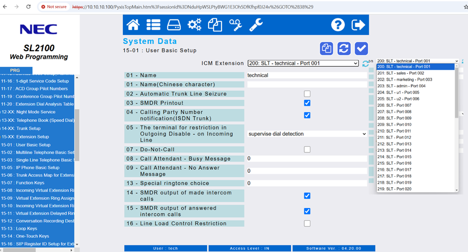 - vào mục 15-01: User Basic Setup để đặt tên cho từng máy nhánh