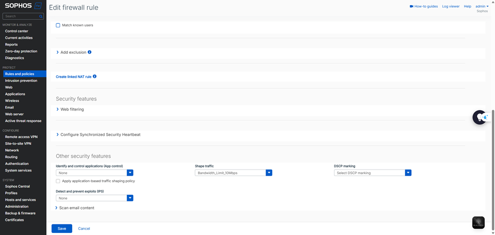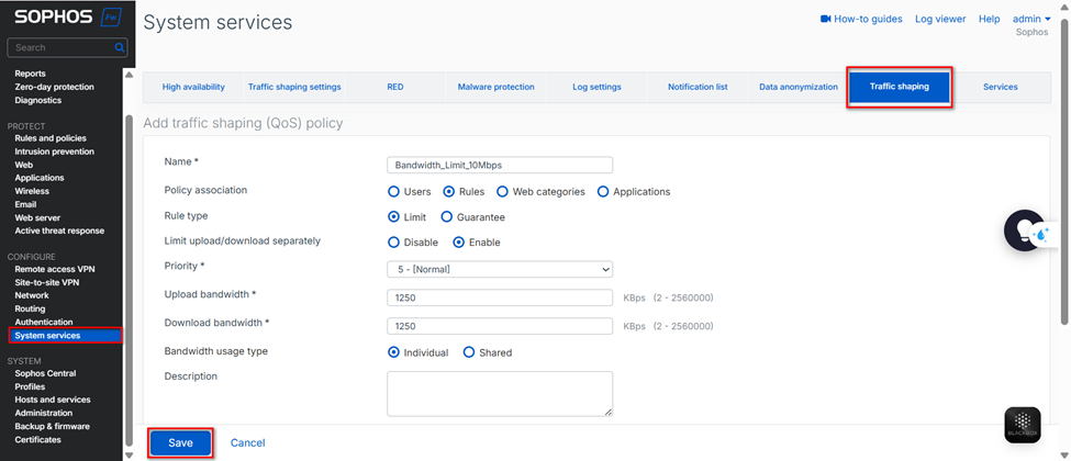 4. Trong phần Traffic Shaping Policy, chọn Bandwidth_Limit_10Mbps.