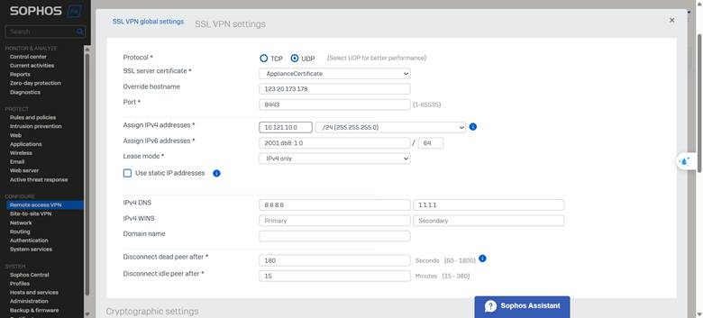 • Assign IPv4 addresses: Nhập dải IP cấp phát cho client VPN (ví dụ: 10.121.10.0/24).