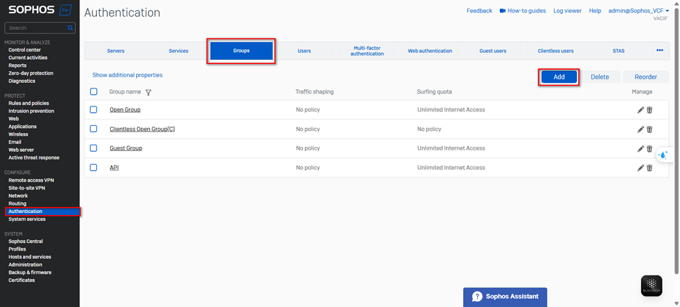 Vào menu Authentication → chuyển sang tab Groups → nhấn Add để tạo nhóm người dùng mới.
