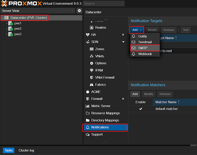 Để cấu hình cảnh báo email trên Proxmox, vào Datacenter -> Notifications. Tiếp theo, trong Notification Targets, nhấn Add -> SMTP