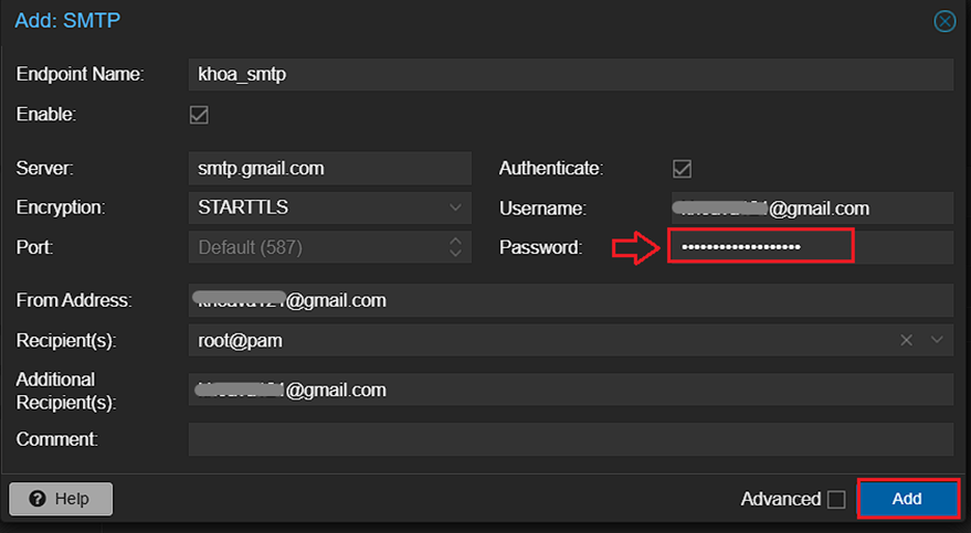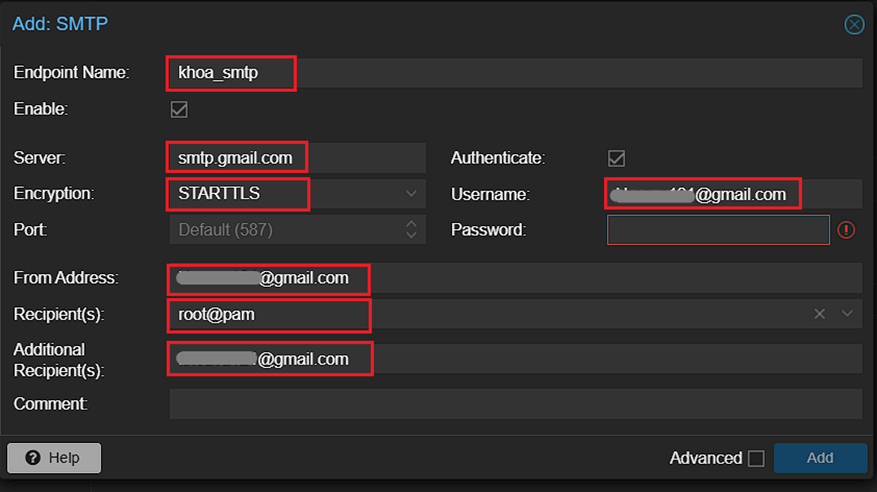 Tiếp theo ta cần điền các thông tin sau để setup SMTP trên Proxmox