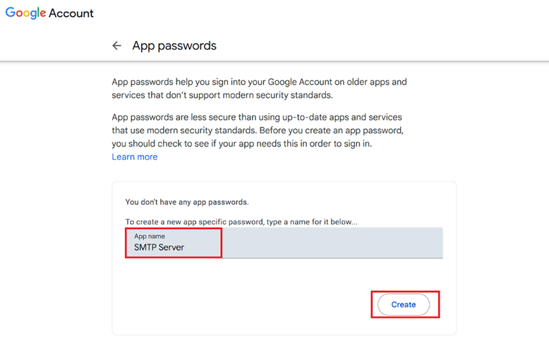 Ta sẽ đặt App name là SMTP Server. Nhấn Create.