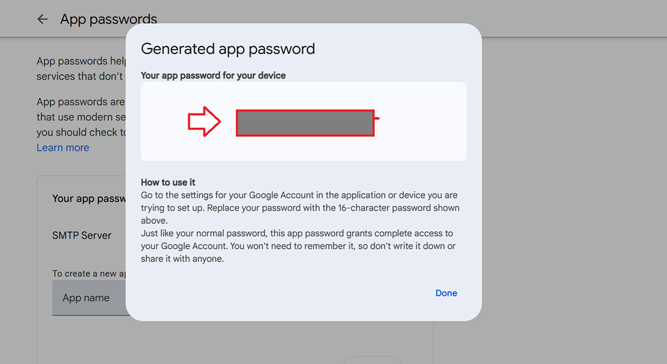Google sẽ generate ra App Password và ta sẽ copy mật khẩu này sang Proxmox và setup tiếp SMTP.
